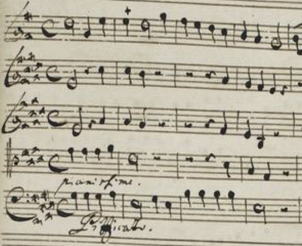 低音はピチカートを指定。バロックアンサンブル上越2016では演奏効果を考えて弦楽パート全部ピチカートで演奏します。
