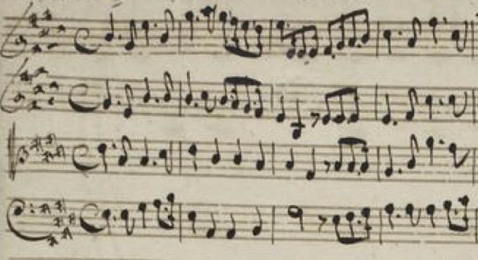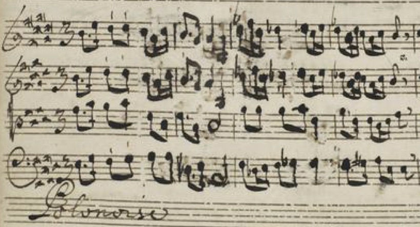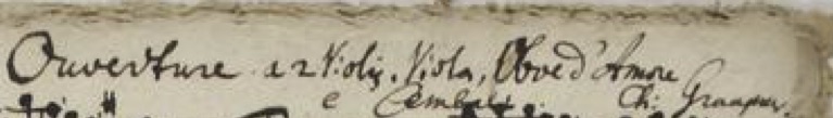 曲全体の題名はなく、冒頭に”Ouverture”と楽器編成を記載。曲中に楽器名は記載なし。オーボエダモーレはinAで記譜、通奏低音の数字なし。
